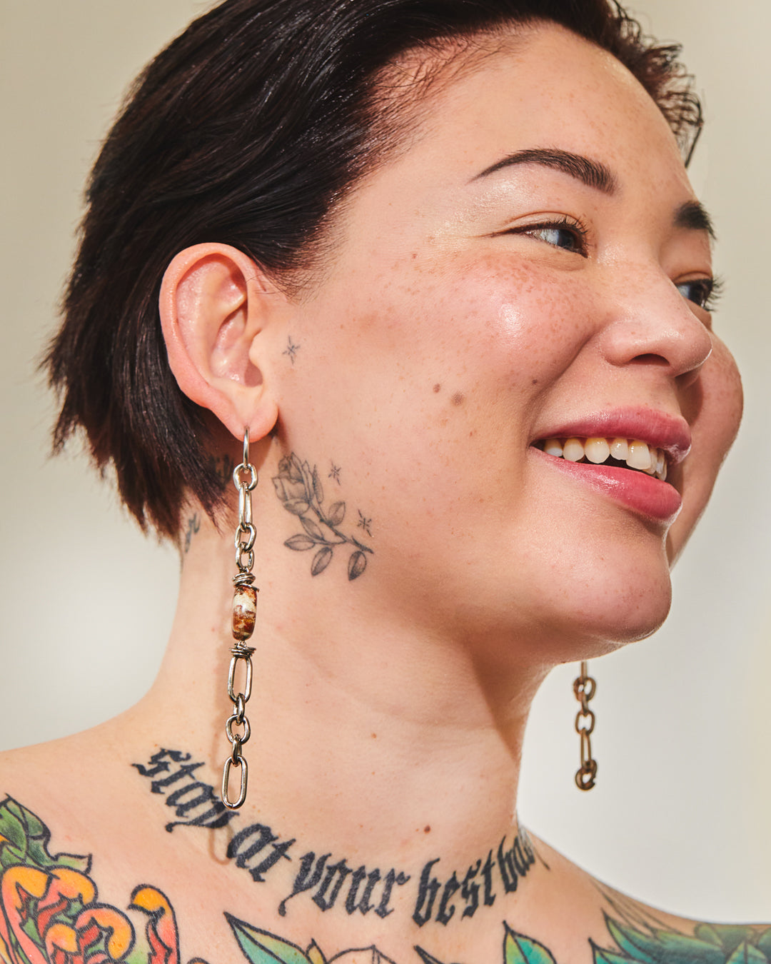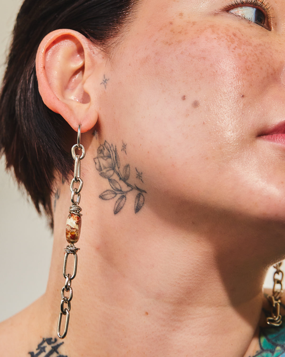 This earring is made with stainless steel, it is hypoallergenic and suitable for those with sensitive skin. They are asymmetrical (Length 11.5cm long side - 9.5cm short side),